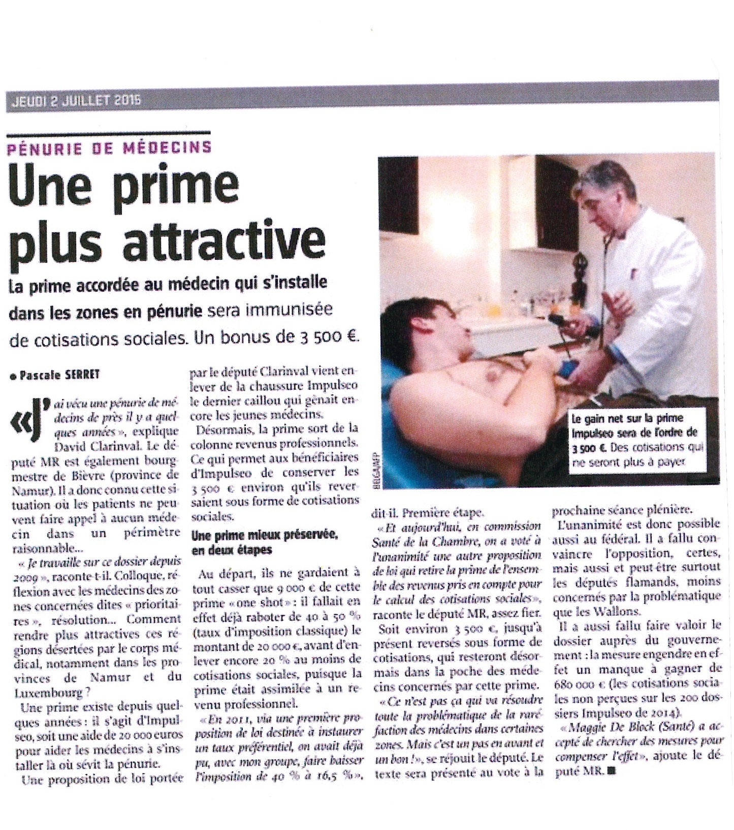 Pénurie de médecins. Une prime plus attractive L'AVENIR, le 2 juillet 2015